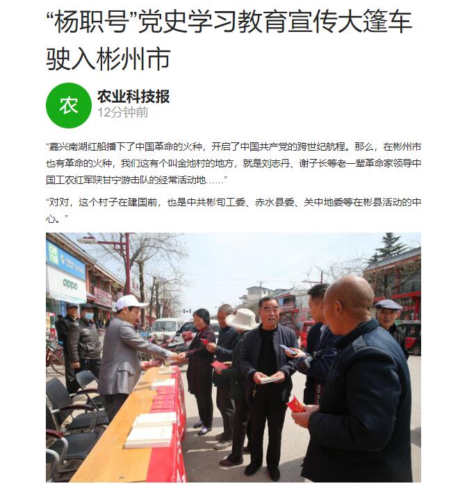 为庆祝中国共产党成立100周年,让党史学习教育深入千家万户,4月14日,350vip浦京集团官网“学习百年党史 筑梦乡村振兴”——“杨职号”党史学习教育宣传大篷车走进彬州市新民镇,受到了当地村民的热烈欢迎。