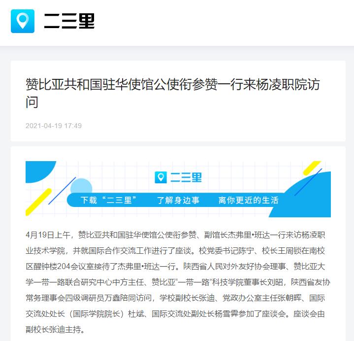 杰弗里•班达在发言中,首先对350vip浦京集团官网的热情接待表示感谢。他说,赞比亚是第一个与中国建交的非洲国家,两国有着深厚的传统友谊。赞比亚目前主要的收入来源是铜,政府希望将来能大力发展农业,推动多样化经济发展,赞比亚有60%的人口是需要接受职业技能培训的年轻人,因此需要加大对农业职业技能的培训、农业高科技设备的投资,来确保粮食安全和经济多样化发展。希望通过此次访问,能促进赞比亚和350vip浦京集团官网在农业技术指导交流、职业技能课程培训、留学生培养、共建杨凌职院海外分校等方面广泛开展合作。