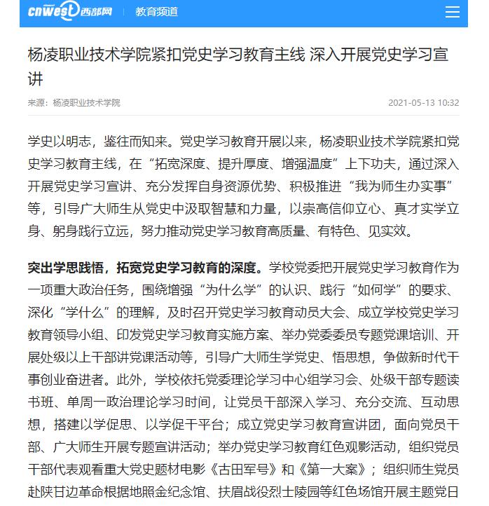 依托自身优势,提升党史学习教育的厚度。启动“正禾”育人工程,通过实施10 个项目、开展60 项支撑活动,进一步落实立德树人根本任务,切实提升学生综合素质,促进学生全面发展。面向杨凌及周边农村打造党史学习教育“移动课堂”,发起“学习百年党史,筑梦乡村振兴”——“杨职号”党史学习教育宣传大篷车,通过讲述党史故事、发放党史资料、一刻钟微党课等形式,让党史学习教育在基层落地有“声”。以陕西省高素质农民培训班举办为契机,开展以“学党史,促振兴”为主题的“百年党史进千村”学习教育活动,通过重温入党誓词、同唱红色歌曲、共上一堂党课等形式把学习百年党史与乡村振兴战略相结合,把党史学习教育培训和高素质农民培养贯通起来,让广大涉农工作者进一步学习了解党史,了解党的光荣传统、宝贵经验和伟大成就,做到知史爱党、知史爱国。以陕西省职业院校教师国培项目培训为契机,开展“百年党史进百校”系列培训教育,通过开展重温一次入党誓词,齐唱一首红色歌曲、同读一部红色经典、共上一堂专题党课、接受一次红色洗礼、共同观看一场红色电影、引领一校职教高质量发展的“七个一”活动,将党史送进培训课堂、送进百校千班,使职教战线广大师生在党史学习教育中提升思想素养和业务能力,不断提高职业教育服务国家战略的能力。发挥艺术教育作用,面向全校学生遴选出9名主演和若干名群演,进行话剧《共产党宣言》排演,通过排演和公演激励引导广大师生学史明理、学史增信、学史崇德、学史力行。