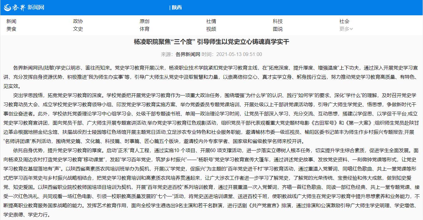 依托自身优势,提升党史学习教育的厚度。启动“正禾”育人工程,通过实施10 个项目、开展60 项支撑活动,进一步落实立德树人根本任务,切实提升学生综合素质,促进学生全面发展。面向杨凌及周边农村打造党史学习教育“移动课堂”,发起“学习百年党史,筑梦乡村振兴”——“杨职号”党史学习教育宣传大篷车,通过讲述党史故事、发放党史资料、一刻钟微党课等形式,让党史学习教育在基层落地有“声”。以陕西省高素质农民培训班举办为契机,开展以“学党史,促振兴”为主题的“百年党史进千村”学习教育活动,通过重温入党誓词、同唱红色歌曲、共上一堂党课等形式把学习百年党史与乡村振兴战略相结合,把党史学习教育培训和高素质农民培养贯通起来,让广大涉农工作者进一步学习了解党史,了解党的光荣传统、宝贵经验和伟大成就,做到知史爱党、知史爱国。以陕西省职业院校教师国培项目培训为契机,开展“百年党史进百校”系列培训教育,通过开展重温一次入党誓词,齐唱一首红色歌曲、同读一部红色经典、共上一堂专题党课、接受一次红色洗礼、共同观看一场红色电影、引领一校职教高质量发展的“七个一”活动,将党史送进培训课堂、送进百校千班,使职教战线广大师生在党史学习教育中提升思想素养和业务能力,不断提高职业教育服务国家战略的能力。发挥艺术教育作用,面向全校学生遴选出9名主演和若干名群演,进行话剧《共产党宣言》排演,通过排演和公演激励引导广大师生学史明理、学史增信、学史崇德、学史力行。