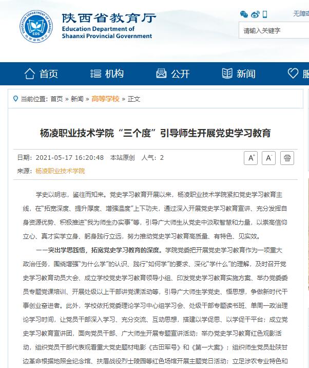 ——依托自身优势,提升党史学习教育的厚度。启动“正禾”育人工程,通过实施10 个项目、开展60 项支撑活动,进一步落实立德树人根本任务,切实提升学生综合素质,促进学生全面发展。面向杨凌及周边农村打造党史学习教育“移动课堂”,发起“学习百年党史,筑梦乡村振兴”——“杨职号”党史学习教育宣传大篷车,通过讲述党史故事、发放党史资料、一刻微钟党课等形式,让党史学习教育在基层落地有“声”。以陕西省高素质农民培训班举办为契机,开展以“学党史,促振兴”为主题的“百年党史进千村”学习教育活动,通过重温入党誓词、同唱红色歌曲、共上一堂党课等形式把学习百年党史与乡村振兴战略相结合,把党史学习教育培训和高素质农民培养贯通起来,让广大涉农工作者进一步学习了解党史,了解党的光荣传统、宝贵经验和伟大成就,做到知史爱党、知史爱国。以陕西省职业院校教师国培项目培训为契机,开展“百年党史进百校”系列培训教育,通过开展重温一次入党誓词,齐唱一首红色歌曲、同读一部红色经典、共上一堂专题党课、接受一次红色洗礼、共同观看一场红色电影、引领一校职教高质量发展的“七个一”活动,将党史送进培训课堂、送进百校千班,使职教战线广大师生在党史学习教育中提升思想素养和业务能力,不断提高职业教育服务国家战略的能力。发挥艺术教育作用,面向全校学生遴选出9名主演和若干名群演,进行话剧《共产党宣言》排演,通过排演和公演激励引导广大师生学史明理、学史增信、学史崇德、学史力行。