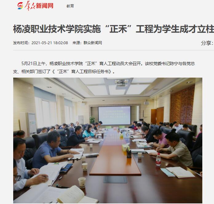 “正禾”育人工程是杨凌职院围绕加强党建工作、推进“三全育人”和深化思政课教学改革三大目标,于今年提出的一项战略性、系统性工程。该工程通过系统梳理新时代大学生的培养目标,有针对性地提出“灯塔引航”“爱国力行”“德种心田”“新知视野”“昂扬奋进”“行为养成”“人文浸润”“耕读修身”“饮水思源”“精技强能”10个项目,通过开展60项支撑活动(包括14项必选活动、46项认领活动),贯穿大一成长教育、大二成才教育、大三职场教育,推进全方位育人;通过建立学校各单位、家庭、社会、学生“四位一体”育人机制;通过实行思政课教师与二级学院结对制度,推进全员育人;通过贯穿“党建+X”工作理念,发挥党组织的战斗堡垒作用和党员先锋模范作用,推进全过程育人。