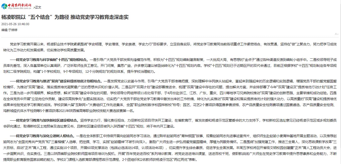 ——将党史学习教育与深化立德树人相结合。一是在全体教职工中持续开展向赵瑜同志学习活动,通过聆听赵瑜同志“育种报国”故事、观看赵瑜同志先进事迹宣传片、组织师生赴赵瑜小麦育种基地开展主题活动,以及推荐赵瑜同志为“全国优秀共产党员”和“三秦楷模”人选等,把挖掘、学习、实践“赵瑜精神”不断引向深入,激励广大师生进一步弘扬爱党爱国精神、厚植为民服务情怀。二是围绕“加强党建工作,推进三全育人,深化思政课教学改革”三大目标,启动“正禾”育人工程,通过实施10个项目、开展60项支撑活动(包括必选活动14项、认领活动46项),切实提升学生综合素质,促进学生全面发展。本周五学校将召开省级文明校园创建暨“正禾”育人工程动员大会,进一步凝聚共识、夯实责任。三是以陕西省职业院校教师国培项目培训为契机,开展“百年党史进百校”系列培训教育,将党史送进培训课堂、送进百校千班,使职教战线广大师生在党史学习教育中提升思想素养和业务能力,不断提高职业教育服务国家战略的能力。学校2门课程入选教育部课程思政示范课程,2个团组织和2名教师获杨凌示范区“两红两优”表彰。