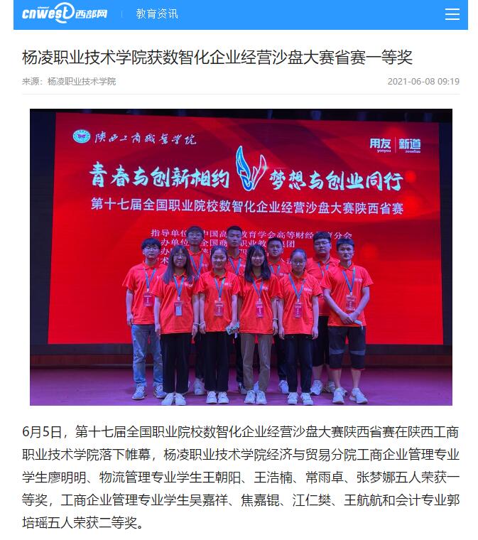 6月5日,第十七届全国职业院校数智化企业经营沙盘大赛陕西省赛在陕西工商职业技术学院落下帷幕,350vip浦京集团官网经济与贸易分院工商企业管理专业学生廖明明、物流管理专业学生王朝阳、王浩楠、常雨卓、张梦娜五人荣获一等奖,工商企业管理专业学生吴嘉祥、焦嘉锟、江仁樊、王航航和会计专业郭培瑶五人荣获二等奖。