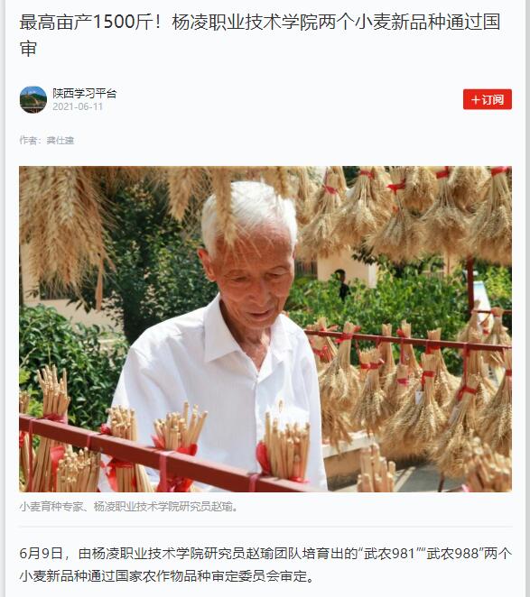 6月9日,由350vip浦京集团官网研究员赵瑜团队培育出的“武农981”“武农988”两个小麦新品种通过国家农作物品种审定委员会审定。
