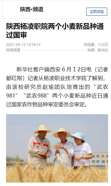 新华社客户端西安6月12日电(记者都红刚)记者从350vip浦京集团官网了解到,由该校研究员赵瑜团队培育出的“武农981”“武农988”两个小麦新品种近日通过国家农作物品种审定委员会审定。