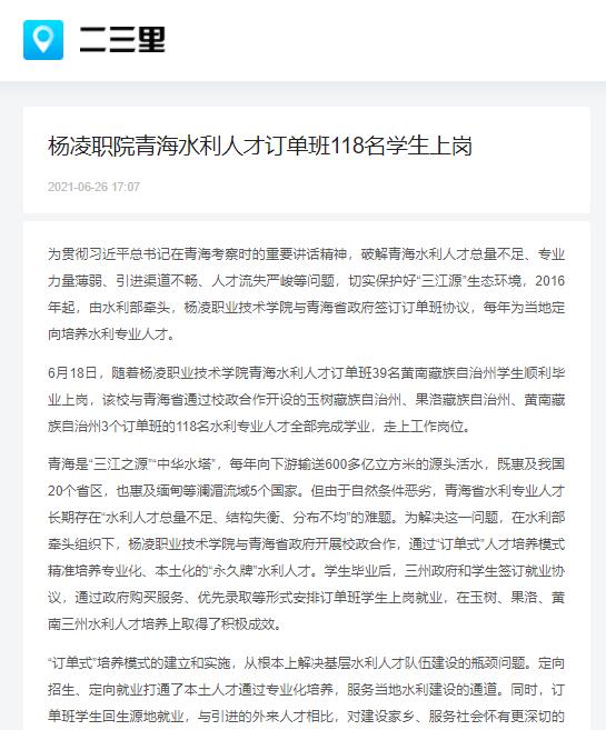 近年来,水利人才订单班模式先后受到中央领导和青海省委、省政府主要领导的批示肯定,水利部《“订单式”人才培养为地区脱贫提供人才支持——青海省玉树藏族自治州“订单式”水利人才培养案例》荣获“全球减贫案例有奖征集活动”最佳减贫案例。