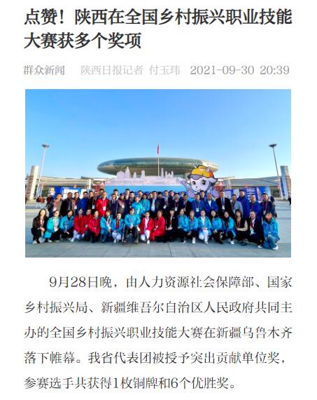 9月28日晚,由人力资源社会保障部、国家乡村振兴局、新疆维吾尔自治区人民政府共同主办的全国乡村振兴职业技能大赛在新疆乌鲁木齐落下帷幕。我省代表团被授予突出贡献单位奖,参赛选手共获得1枚铜牌和6个优胜奖。