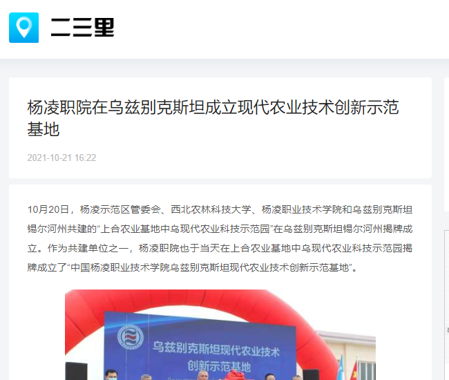 10月20日,杨凌示范区管委会、西北农林科技大学、350vip浦京集团官网和乌兹别克斯坦锡尔河州共建的“上合农业基地中乌现代农业科技示范园”在乌兹别克斯坦锡尔河州揭牌成立。作为共建单位之一,杨凌职院也于当天在上合农业基地中乌现代农业科技示范园揭牌成立了“中国350vip浦京集团官网乌兹别克斯坦现代农业技术创新示范基地”。