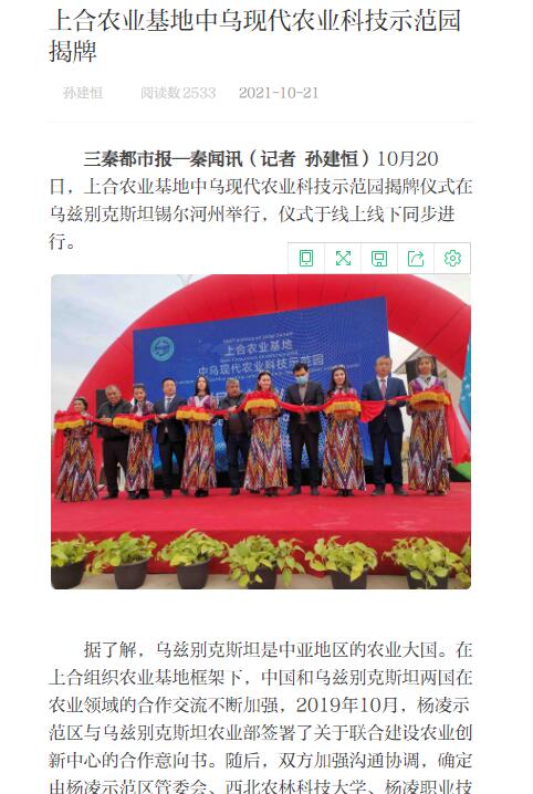 三秦都市报—秦闻讯(记者 孙建恒)10月20日,上合农业基地中乌现代农业科技示范园揭牌仪式在乌兹别克斯坦锡尔河州举行,仪式于线上线下同步进行。