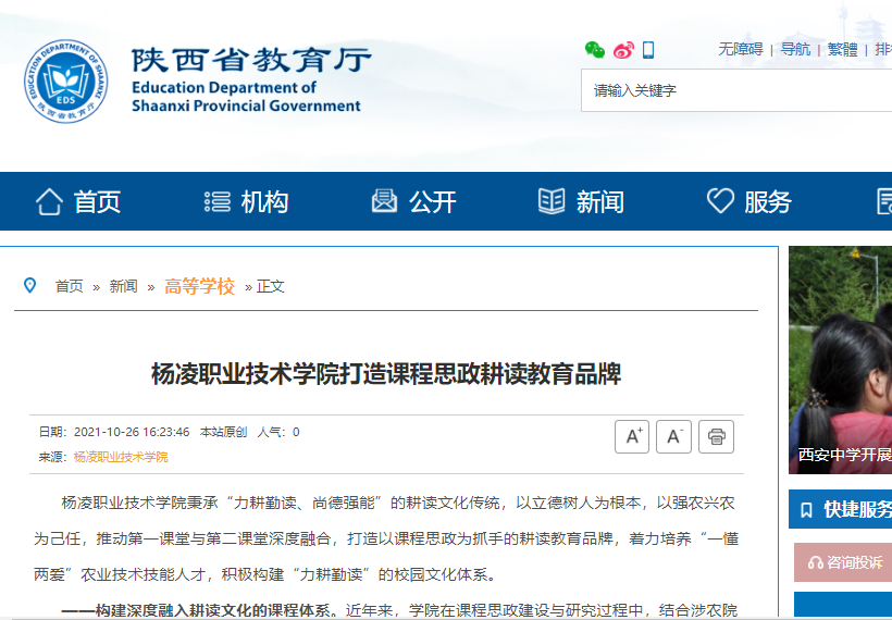 ——形成“读学看践赛悟”的课程思政教育新模式。读,开展经典晨读活动。组织学生以班级为单位利用早晨课前20分钟,开展包含农耕文化、二十四节气、经典古诗文等内容的“中华经典晨读”,同时将考评成绩纳入《大学生第二课堂成绩单》考评体系。通过晨读传承农耕文化等中华优秀传统文化,促进学生学习热情和阅读行为养成。学,农科专家精神事迹。在专业课程教学中融入后稷教民稼穑、农业行业历史名人的励志素材,邀请农业专家、院士现场授课,让学生树立“知农爱农、强农兴农”的思想认识。看,现代农业发展成就。利用杨凌示范区现代农业产业优势条件,在涉农专业学生中开展“进企业看示范”活动,让学生了解现代农业发展的成就,坚定服务“三农”的信心。践,行万里路实践育人。带领学生走进农村、走近农民、走向农业,深入田间地头、深入绿水青山,把乡情乡愁融入血脉中,拓展课程思政建设方法和途径。赛,开展各类竞赛比赛。定期举办中华传统诗歌诵读比赛、耕读文化书画展,二十四节气摄影、知识竞赛、主题征文等展演活动,尤其是在每年“冬至”节气举办的“万名师生冬至包饺子活动”,数十家媒体竞相报道,在全国高校学生中引起了强烈反响。悟,内化于心外化于行。通过全方位的引导、教育,帮助学生更好理解国家发展战略、增强“四个自信”,培养学生的“大国三农”情怀,引导学生不断增强服务农业农村现代化、服务乡村振兴的使命感和责任感。