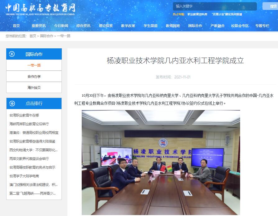中国-几内亚水利工程专业教育合作项目(350vip浦京集团官网几内亚水利工程学院),是杨凌职院积极响应国家“一带一路”倡议和习近平总书记在2018年中非合作论坛北京峰会上提出的“八大行动计划”中的“实施人文交流行动”的一项重要国际教育交流合作举措。项目将培养国际学生、与非洲国家分享学校水利工程专业及课程标准、“中文+职业技能”、师生专业技术培训、服务中国走出去企业等多项国际合作交流工作有机结合,形成“多位一体”的国际教育交流合作模式。该合作项目的开展有利于促进中国与几内亚之间的教育交流与合作,分享两国彼此在高等教育发展中取得的成果,为在非洲的中资企业及其他企业在相关产业领域科技发展提供技术及人才支持。