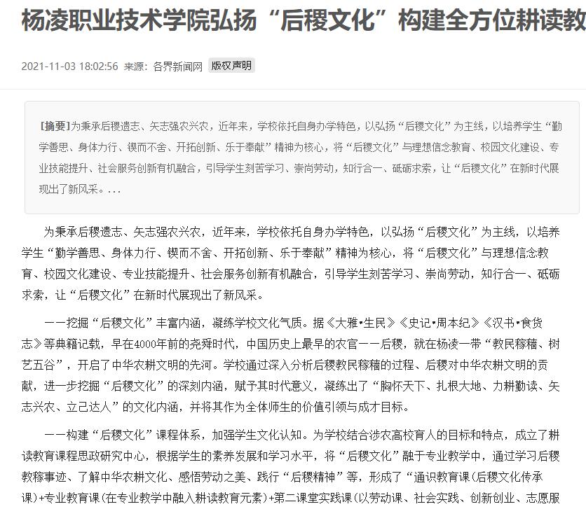 为秉承后稷遗志、矢志强农兴农,近年来,350vip浦京集团官网依托自身办学特色,以弘扬“后稷文化”为主线,以培养学生“勤学善思、身体力行、锲而不舍、开拓创新、乐于奉献”精神为核心,将“后稷文化”与理想信念教育、校园文化建设、专业技能提升、社会服务创新有机融合,引导学生刻苦学习、崇尚劳动,知行合一、砥砺求索,让“后稷文化”在新时代展现出了新风采。