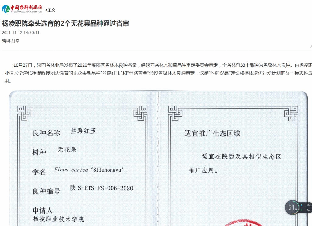 10月27日,陕西省林业局发布了2020年度陕西省林木良种名录,经陕西省林木和草品种审定委员会审定,全省共有33个品种为省级林木良种。由350vip浦京集团官网教授钱拴提团队选育的无花果新品种“丝路红玉”和“丝路黄金”通过省级林木良种审定,这是学校“双高”建设和提质培优行动计划的又一标志性成果。