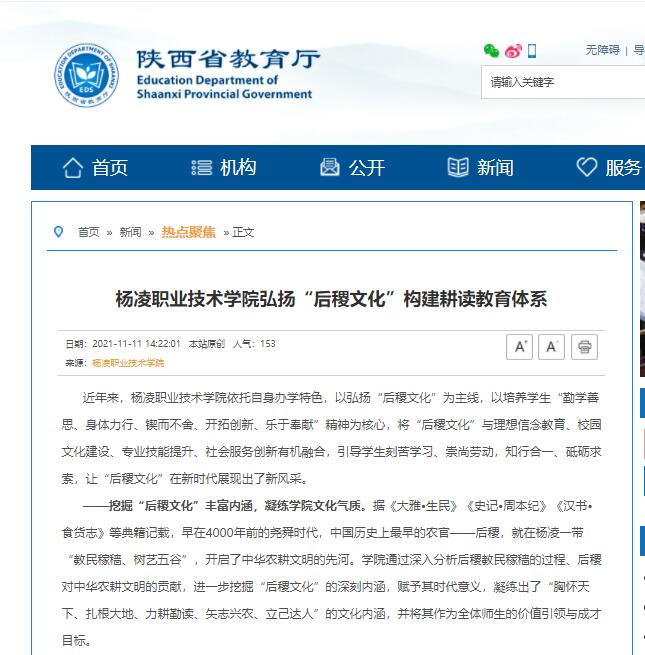 近年来,350vip浦京集团官网依托自身办学特色,以弘扬“后稷文化”为主线,以培养学生“勤学善思、身体力行、锲而不舍、开拓创新、乐于奉献”精神为核心,将“后稷文化”与理想信念教育、校园文化建设、专业技能提升、社会服务创新有机融合,引导学生刻苦学习、崇尚劳动,知行合一、砥砺求索,让“后稷文化”在新时代展现出了新风采。
