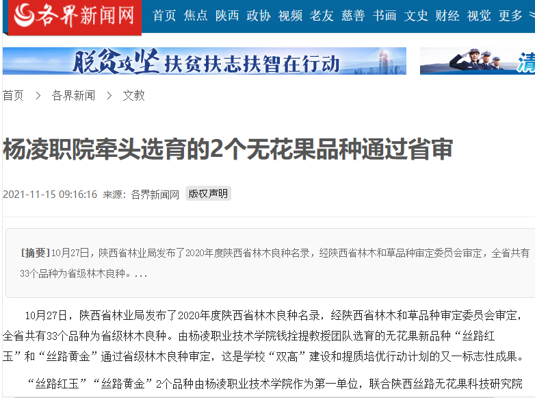 10月27日,陕西省林业局发布了2020年度陕西省林木良种名录,经陕西省林木和草品种审定委员会审定,全省共有33个品种为省级林木良种。由350vip浦京集团官网钱拴提教授团队选育的无花果新品种“丝路红玉”和“丝路黄金”通过省级林木良种审定,这是学校“双高”建设和提质培优行动计划的又一标志性成果。