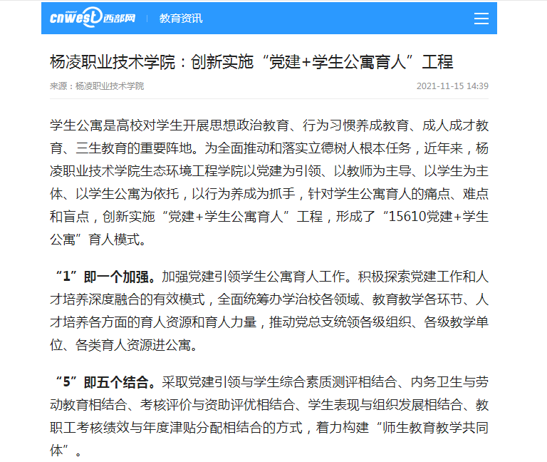 通过多年的创新与实践,该工作取得了显著成效。一是形成了可复制、可推广的《高职院校“党建+15610学生公寓”集成式育人模式的创新与实践工作方案》,现已在省内外8所高校推广应用,并荣获学校2020年教育教学成果特等奖。二是建立了三全育人绩效津贴分配制度。三是形成的《生态环境工程学院“党建+学生公寓”三全育人实践与探索》案例,入选教育部“双高”建设项目党建育人典型案例。四是“党建+学生公寓三全育人工程”获批全省高校学生工作精品项目、学校党建工作重点课题。五是涌现了一批先进集体和先进个人,学校先后获“全省高校师德建设示范团队”“陕西高等教育教学管理先进集体”“全省高校学雷锋活动示范点”“陕西高校志愿服务优秀项目”“干事创业好班子”等多项省级荣誉;1名教师获全省“教书育人楷模”,1名教师获全省教育系统优秀共产党员。