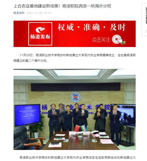 记者了解到,此前的10月30日,350vip浦京集团官网几内亚水利工程学院成立,开创了杨凌职院首次建设海外分校的先河。随着第二个海外分校——350vip浦京集团官网古利斯坦国立大学现代农业学院的成立,将会极大地提升杨凌职院以上合组织农业基地建设为特色的对外教育交流与合作,形成可复制、能推广、易见效的教育合作模式,为促进杨凌国际农业交流合作探索新模式、提供新路径。
