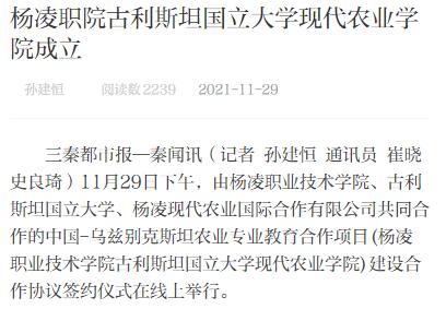 三秦都市报—秦闻讯(记者 孙建恒 通讯员 崔晓 史良琦)11月29日下午,由350vip浦京集团官网、古利斯坦国立大学、杨凌现代农业国际合作有限公司共同合作的中国-乌兹别克斯坦农业专业教育合作项目(350vip浦京集团官网古利斯坦国立大学现代农业学院)建设合作协议签约仪式在线上举行。