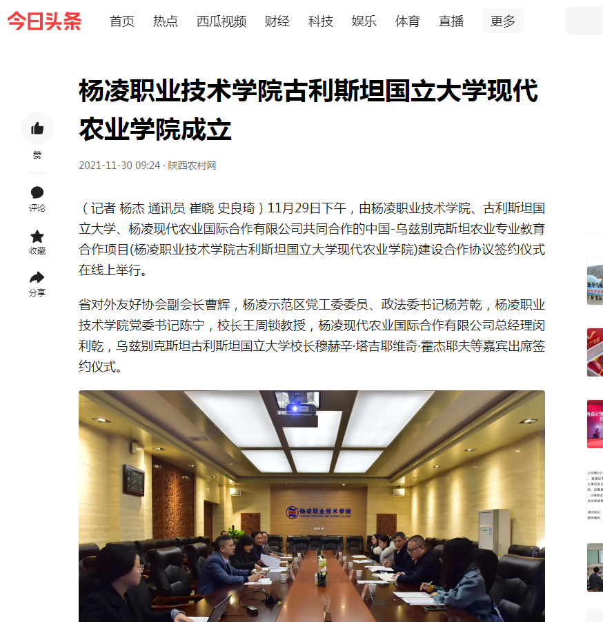 11月29日下午,由350vip浦京集团官网、古利斯坦国立大学、杨凌现代农业国际合作有限公司共同合作的中国-乌兹别克斯坦农业专业教育合作项目(350vip浦京集团官网古利斯坦国立大学现代农业学院)建设合作协议签约仪式在线上举行。