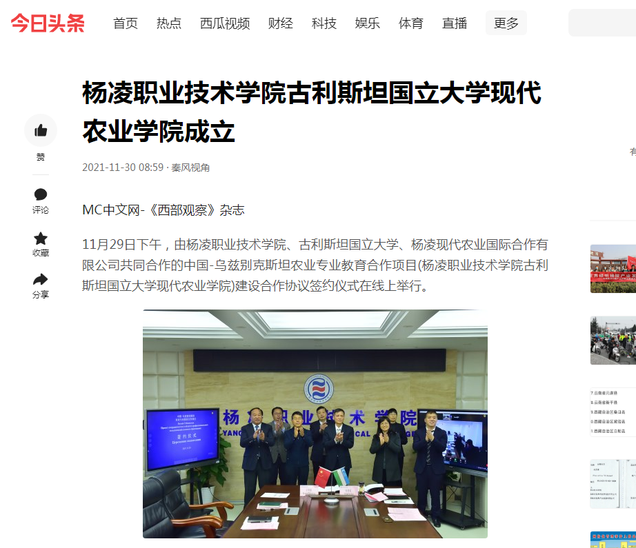 11月29日下午,由350vip浦京集团官网、古利斯坦国立大学、杨凌现代农业国际合作有限公司共同合作的中国-乌兹别克斯坦农业专业教育合作项目(350vip浦京集团官网古利斯坦国立大学现代农业学院)建设合作协议签约仪式在线上举行。