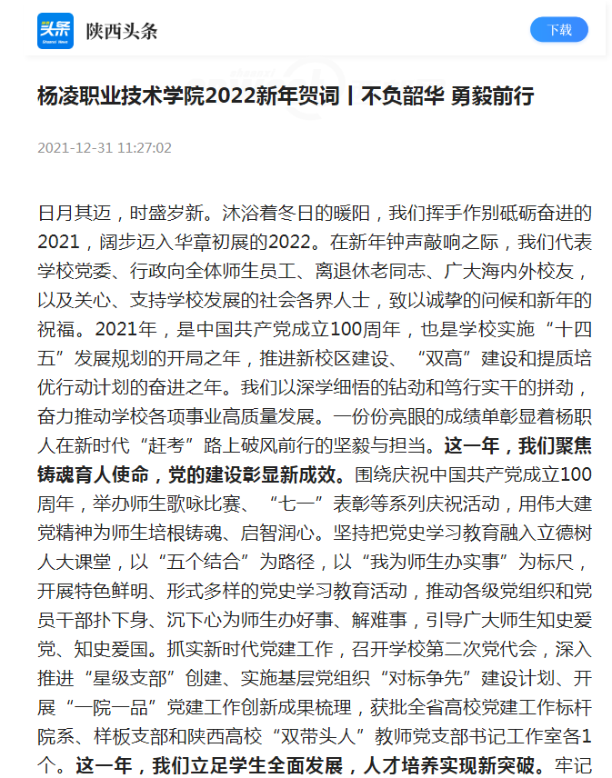 日月其迈,时盛岁新。沐浴着冬日的暖阳,我们挥手作别砥砺奋进的2021,阔步迈入华章初展的2022。在新年钟声敲响之际,我们代表学校党委、行政向全体师生员工、离退休老同志、广大海内外校友,以及关心、支持学校发展的社会各界人士,致以诚挚的问候和新年的祝福。2021年,是中国共产党成立100周年,也是学校实施“十四五”发展规划的开局之年,推进新校区建设、“双高”建设和提质培优行动计划的奋进之年。我们以深学细悟的钻劲和笃行实干的拼劲,奋力推动学校各项事业高质量发展。一份份亮眼的成绩单彰显着杨职人在新时代“赶考”路上破风前行的坚毅与担当。
