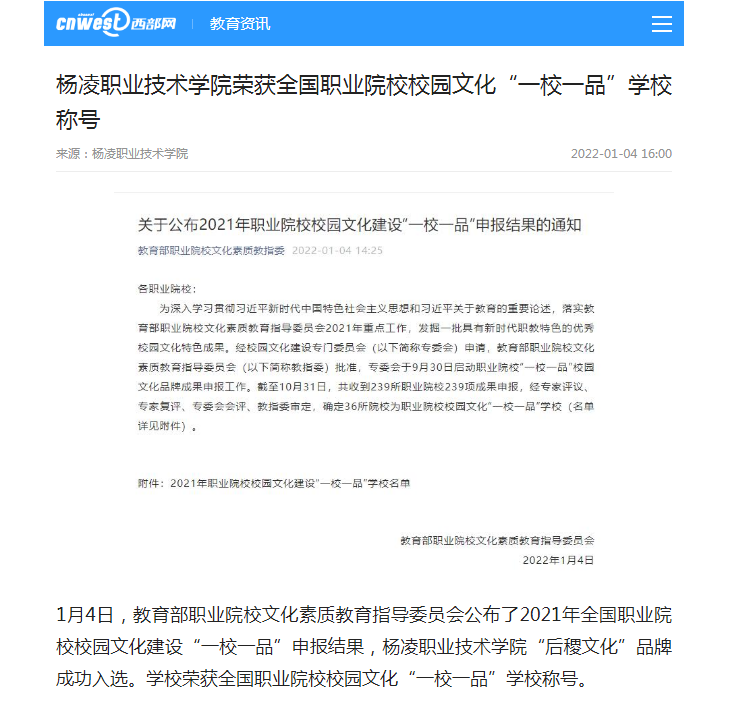 1月4日,教育部职业院校文化素质教育指导委员会公布了2021年全国职业院校校园文化建设“一校一品”申报结果,350vip浦京集团官网“后稷文化”品牌成功入选。学校荣获全国职业院校校园文化“一校一品”学校称号。