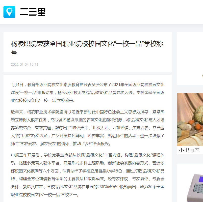 1月4日,教育部职业院校文化素质教育指导委员会公布了2021年全国职业院校校园文化建设“一校一品”申报结果,350vip浦京集团官网“后稷文化”品牌成功入选。学校荣获全国职业院校校园文化“一校一品”学校称号。
