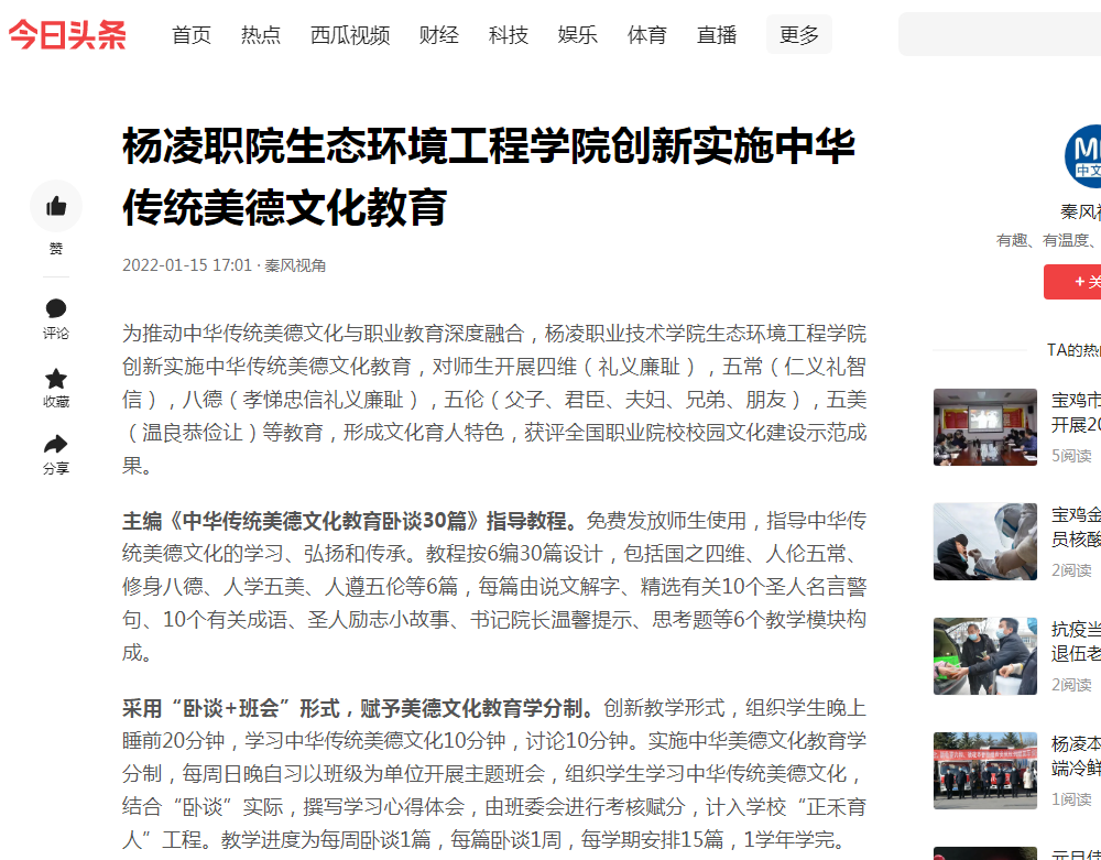 为推动中华传统美德文化与职业教育深度融合,350vip浦京集团官网生态环境工程学院创新实施中华传统美德文化教育,对师生开展四维(礼义廉耻),五常(仁义礼智信),八德(孝悌忠信礼义廉耻),五伦(父子、君臣、夫妇、兄弟、朋友),五美(温良恭俭让)等教育,形成文化育人特色,获评全国职业院校校园文化建设示范成果。