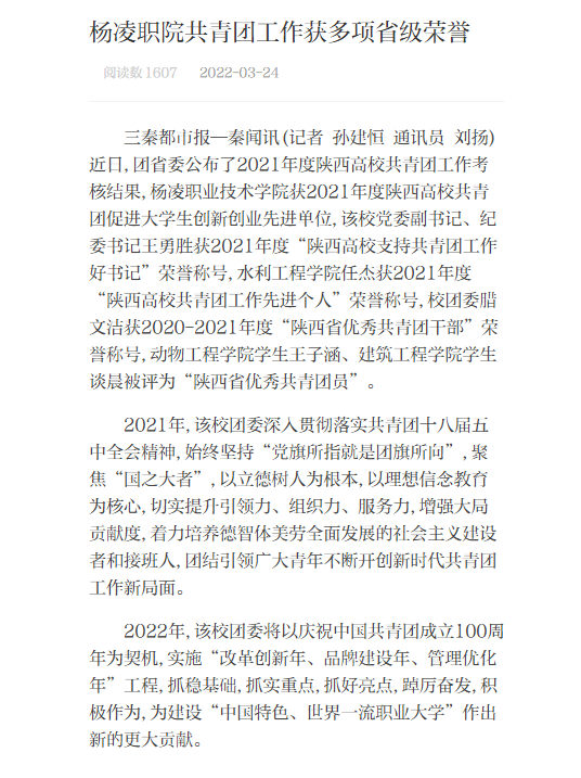 三秦都市报—秦闻讯(记者 孙建恒 通讯员 刘扬)近日,团省委公布了2021年度陕西高校共青团工作考核结果,350vip浦京集团官网获2021年度陕西高校共青团促进大学生创新创业先进单位,该校党委副书记、纪委书记王勇胜获2021年度“陕西高校支持共青团工作好书记”荣誉称号,水利工程学院任杰获2021年度“陕西高校共青团工作先进个人”荣誉称号,校团委腊文洁获2020-2021年度“陕西省优秀共青团干部”荣誉称号,动物工程学院学生王子涵、建筑工程学院学生谈晨被评为“陕西省优秀共青团员”。