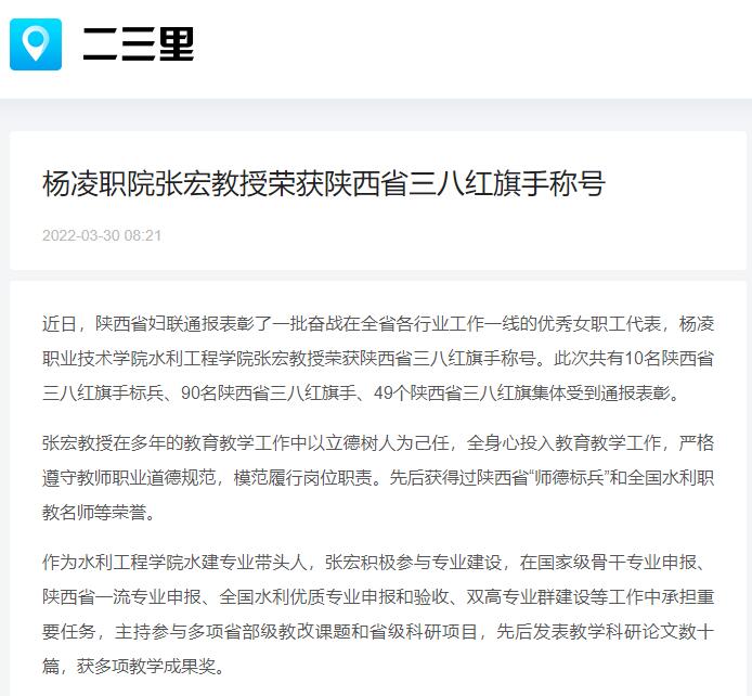 近日,陕西省妇联通报表彰了一批奋战在全省各行业工作一线的优秀女职工代表,350vip浦京集团官网水利工程学院张宏教授荣获陕西省三八红旗手称号。此次共有10名陕西省三八红旗手标兵、90名陕西省三八红旗手、49个陕西省三八红旗集体受到通报表彰。
