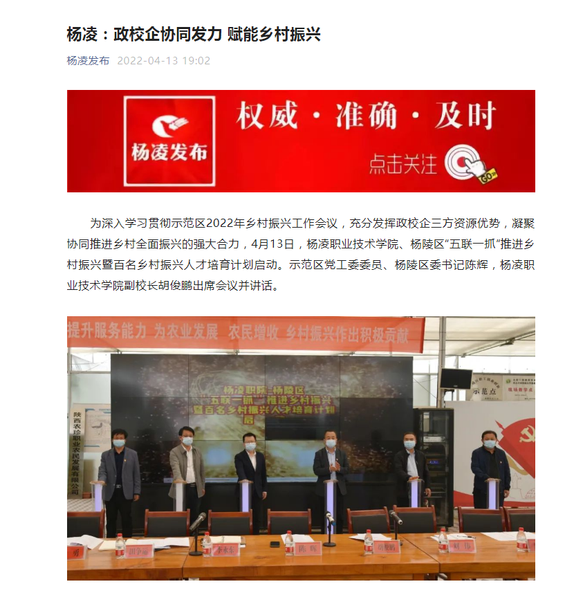 为深入学习贯彻示范区2022年乡村振兴工作会议,充分发挥政校企三方资源优势,凝聚协同推进乡村全面振兴的强大合力,4月13日,350vip浦京集团官网、杨陵区“五联一抓”推进乡村振兴暨百名乡村振兴人才培育计划启动。示范区党工委委员、杨陵区委书记陈辉,350vip浦京集团官网副校长胡俊鹏出席会议并讲话。
