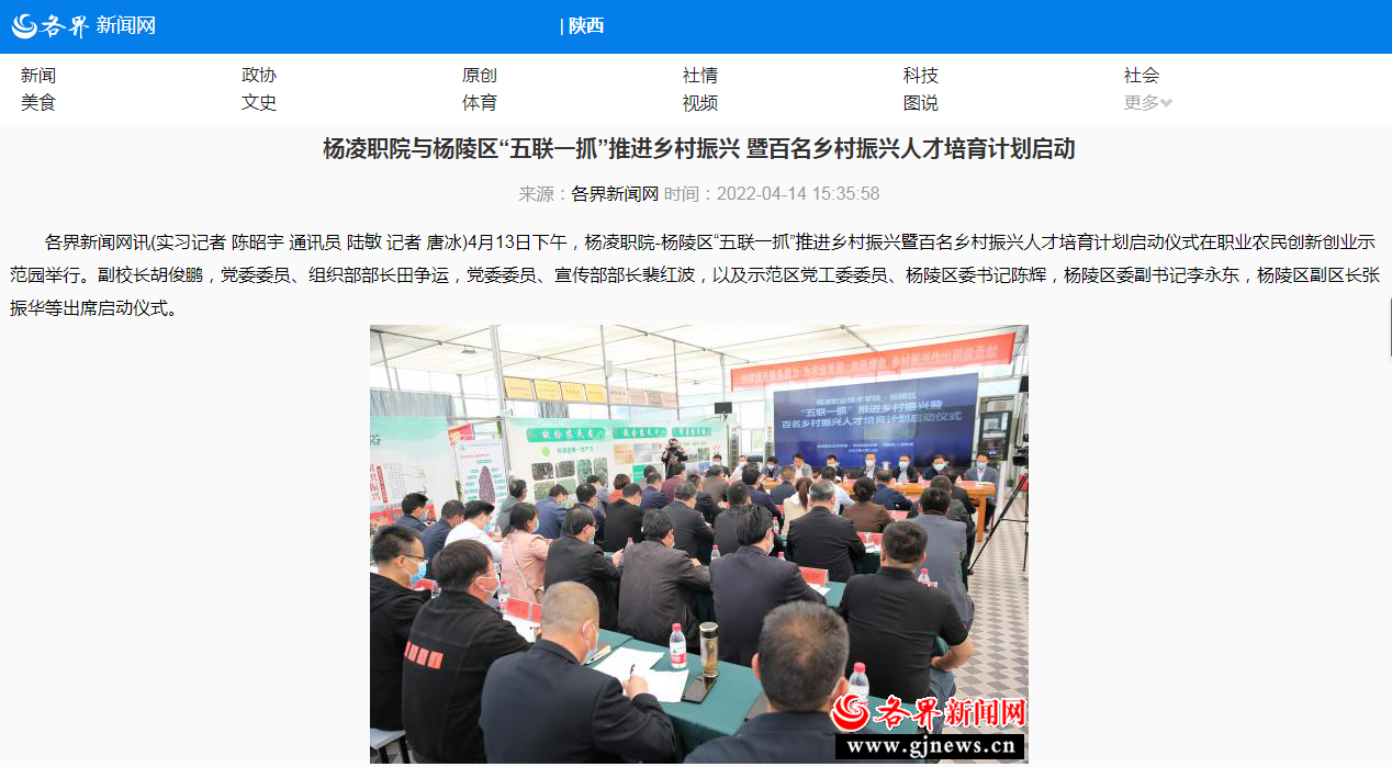 各界新闻网讯(实习记者 陈昭宇 通讯员 陆敏 记者 唐冰)4月13日下午,杨凌职院-杨陵区“五联一抓”推进乡村振兴暨百名乡村振兴人才培育计划启动仪式在职业农民创新创业示范园举行。副校长胡俊鹏,党委委员、组织部部长田争运,党委委员、宣传部部长裴红波,以及示范区党工委委员、杨陵区委书记陈辉,杨陵区委副书记李永东,杨陵区副区长张振华等出席启动仪式。