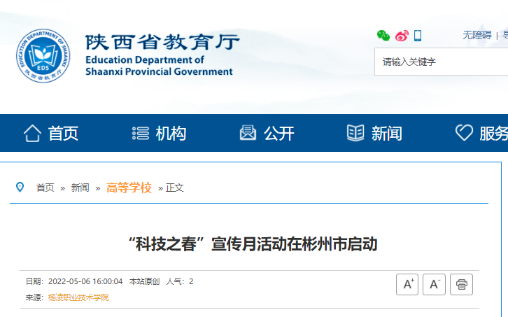 2022年4月26日,由陕西省教育厅主办、350vip浦京集团官网承办的第三十届“科技之春”宣传月活动在彬州市新民镇启动。