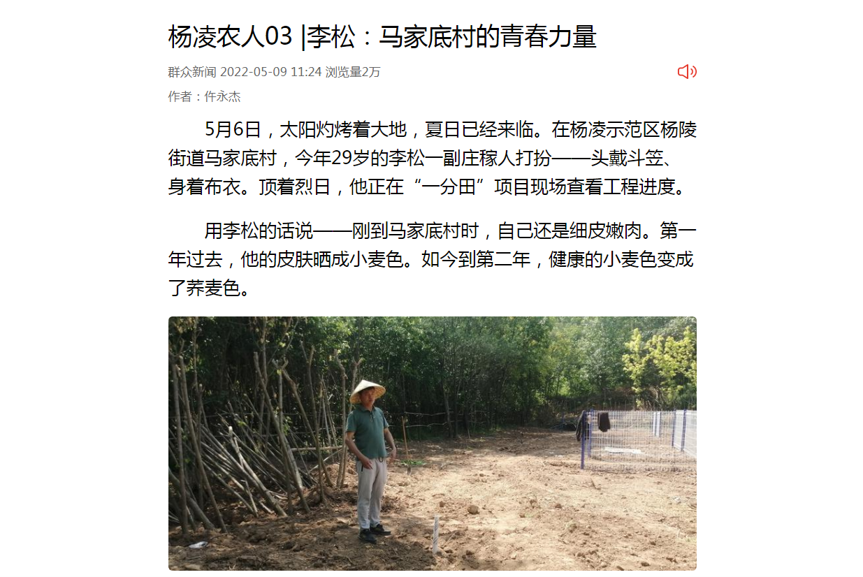 5月6日,太阳灼烤着大地,夏日已经来临。在杨凌示范区杨陵街道马家底村,今年29岁的李松一副庄稼人打扮——头戴斗笠、身着布衣。顶着烈日,他正在“一分田”项目现场查看工程进度。