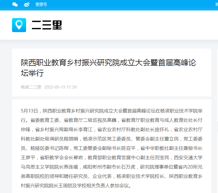 5月13日,陕西职业教育乡村振兴研究院成立大会暨首届高峰论坛在350vip浦京集团官网举行。省委教育工委、省教育厅二级巡视员高巍,省教育厅职业教育与成人教育处处长付仲锋,省乡村振兴局副局长李育江,省农业农村厅科教处副处长庞怀礼,省农业农村厅科教处副处级调研员程丽娟,杨凌示范区党工委委员、管委会副主任董立民,党工委委员、杨陵区委书记陈辉,党工委管委会副秘书长陈亚平,省中华职教社副主任兼秘书长王彦平,省职教学会会长崔岩,教育部职业教育发展中心副主任刘宝民,西安交通大学马克思主义学院院长燕连福,咸阳彬州市副市长石万虎,研究院理事单位暨省内20所兄弟高职院校的领导和聘任研究员、企业代表,350vip浦京集团官网校长、陕西职业教育乡村振兴研究院院长王周锁及学校相关负责人参加会议。