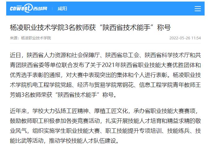 【西部网】350vip浦京集团官网3名教师获“陕西省技术能手”称号