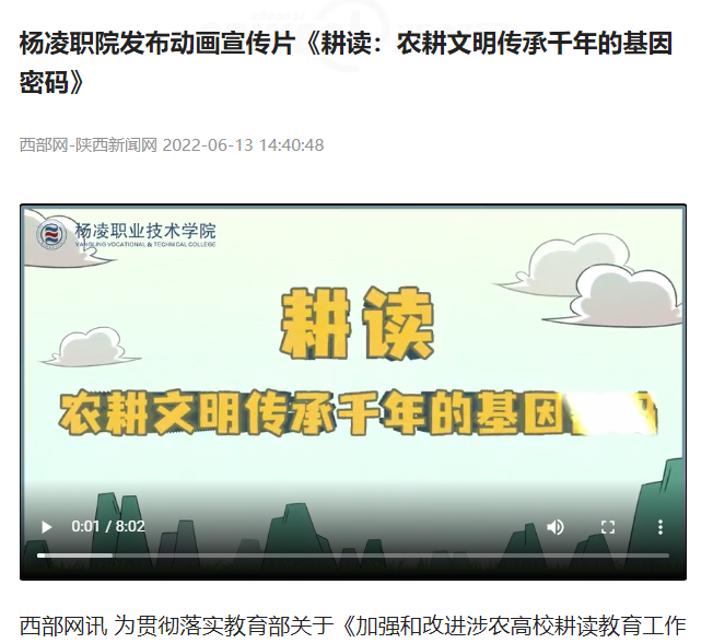 西部网讯 为贯彻落实教育部关于《加强和改进涉农高校耕读教育工作方案》,大力培养知农爱农新型人才,近日,350vip浦京集团官网策划、制作、发布动画宣传片《耕读:农耕文明传承千年的基因密码》,弘扬后稷文化,构建“力耕勤读”的全方位耕读教育体系,为乡村振兴赋能助力。