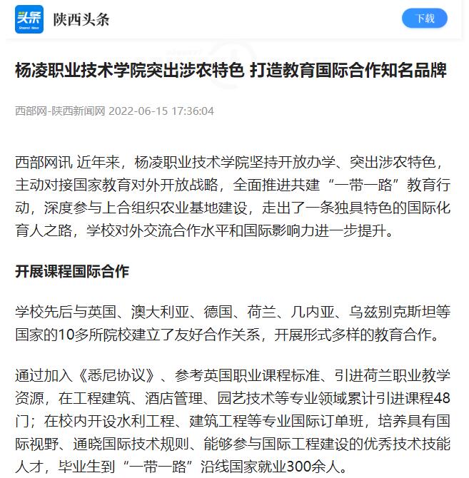 通过加入《悉尼协议》、参考英国职业课程标准、引进荷兰职业教学资源,在工程建筑、酒店管理、园艺技术等专业领域累计引进课程48门;在校内开设水利工程、建筑工程等专业国际订单班,培养具有国际视野、通晓国际技术规则、能够参与国际工程建设的优秀技术技能人才,毕业生到“一带一路”沿线国家就业300余人。