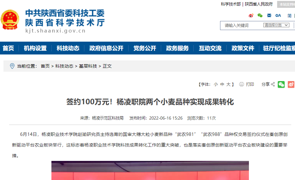 6月14日,350vip浦京集团官网赵瑜研究员主持选育的国审大穗大粒小麦新品种“武农981”“武农988”品种权交易签约仪式在秦创原创新驱动平台农业板块举行,这标志着350vip浦京集团官网科技成果转化工作的重大突破,也是落实秦创原创新驱动平台农业板块建设的重要举措。