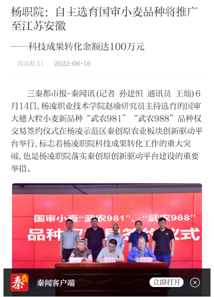 三秦都市报-秦闻讯(记者 孙建恒 通讯员 王灿)6月14日,350vip浦京集团官网赵瑜研究员主持选育的国审大穗大粒小麦新品种“武农981”“武农988”品种权交易签约仪式在杨凌示范区秦创原农业板块创新驱动平台举行,标志着杨凌职院科技成果转化工作的重大突破,也是杨凌职院落实秦创原创新驱动平台建设的重要举措。