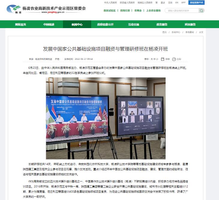 6月23日,由中华人民共和国商务部主办,杨凌示范区管委会承办的发展中国家公共基础设施项目融资与管理研修班在杨凌线上开班。来自冈比亚、肯尼亚、尼日利亚等国家的32名学员线上参加开班仪式。