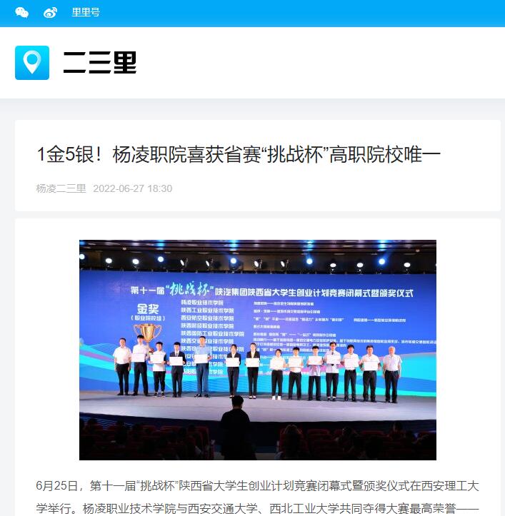 6月25日,第十一届“挑战杯”陕西省大学生创业计划竞赛闭幕式暨颁奖仪式在西安理工大学举行。350vip浦京集团官网与西安交通大学、西北工业大学共同夺得大赛最高荣誉——“挑战杯”,是唯一获此殊荣的高职院校,学校参赛项目荣获金奖1项,银奖5项。