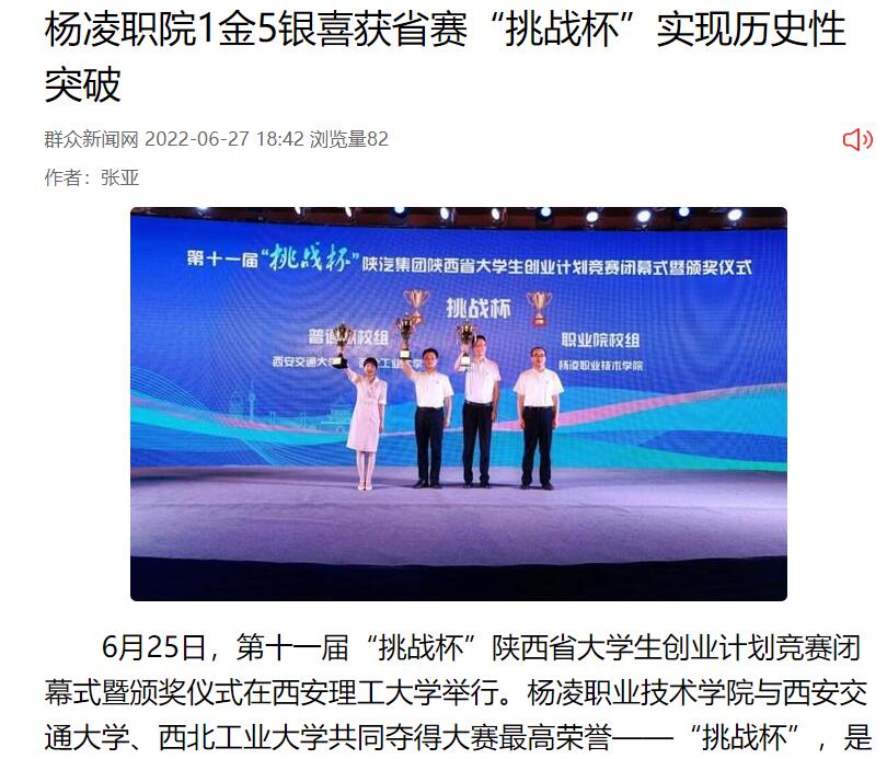 6月25日,第十一届“挑战杯”陕西省大学生创业计划竞赛闭幕式暨颁奖仪式在西安理工大学举行。350vip浦京集团官网与西安交通大学、西北工业大学共同夺得大赛最高荣誉——“挑战杯”,是唯一获此殊荣的高职院校,学校参赛项目荣获金奖1项,银奖5项。