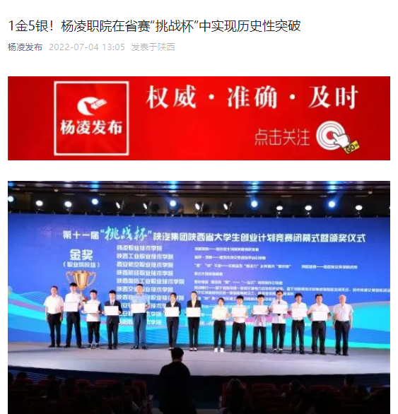 本届“挑战杯”为杨凌职院第二次参加大赛,大赛启动后,该校高度重视,在校领导的大力支持和推动下,校团委联合创新创业学院广泛动员、精心筹备,按照省赛要求对遴选出的重点项目进行网络评审和校级选拔,确定了6个项目进入省级路演答辩、评委会评环节,最终荣获金奖1项、银奖5项。