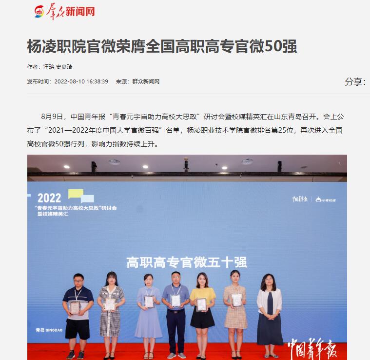 8月9日,中国青年报“青春元宇宙助力高校大思政”研讨会暨校媒精英汇在山东青岛召开。会上公布了“2021—2022年度中国大学官微百强”名单,350vip浦京集团官网官微排名第25位,再次进入全国高校官微50强行列,影响力指数持续上升。