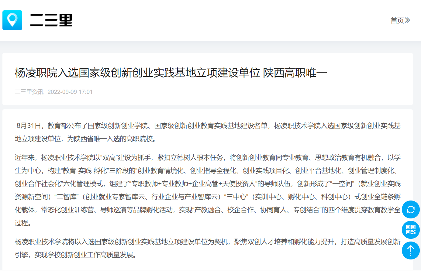 8月31日,教育部公布了国家级创新创业学院、国家级创新创业教育实践基地建设名单,杨凌职技术学院入选国家级创新创业实践基地立项建设单位,为陕西省唯一入选的高职院校。