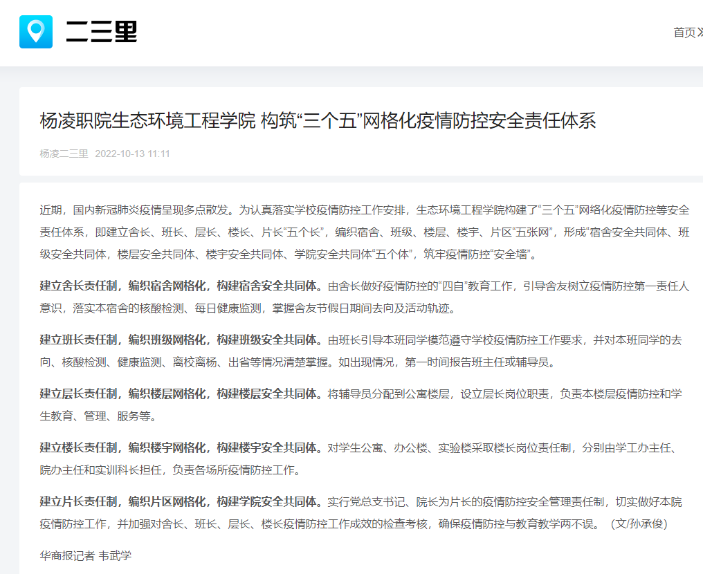 建立片长责任制,编织片区网格化,构建学院安全共同体。实行党总支书记、院长为片长的疫情防控安全管理责任制,切实做好本院疫情防控工作,并加强对舍长、班长、层长、楼长疫情防控工作成效的检查考核,确保疫情防控与教育教学两不误。(文/孙承俊)