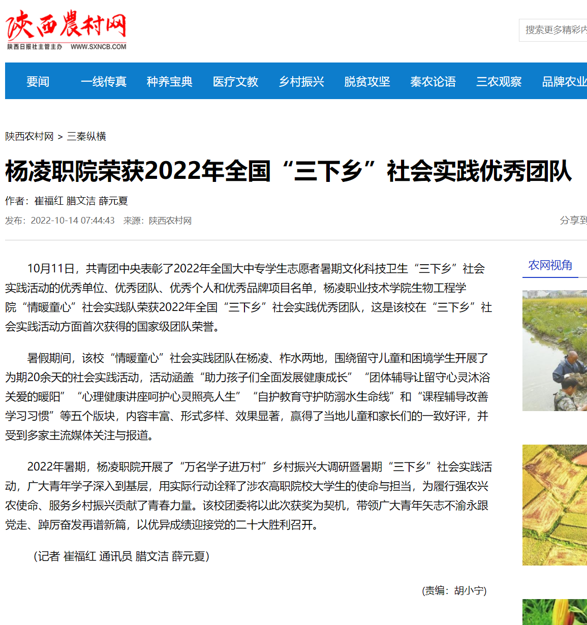2022年暑期,杨凌职院开展了“万名学子进万村”乡村振兴大调研暨暑期“三下乡”社会实践活动,广大青年学子深入到基层,用实际行动诠释了涉农高职院校大学生的使命与担当,为履行强农兴农使命、服务乡村振兴贡献了青春力量。该校团委将以此次获奖为契机,带领广大青年矢志不渝永跟党走、踔厉奋发再谱新篇,以优异成绩迎接党的二十大胜利召开。