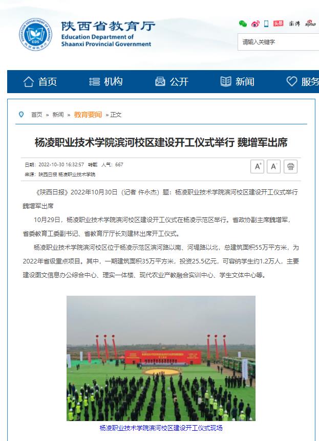 10月29日,350vip浦京集团官网滨河校区建设开工仪式在杨凌示范区举行。省政协副主席魏增军,省委教育工委副书记、省教育厅厅长刘建林出席开工仪式。
